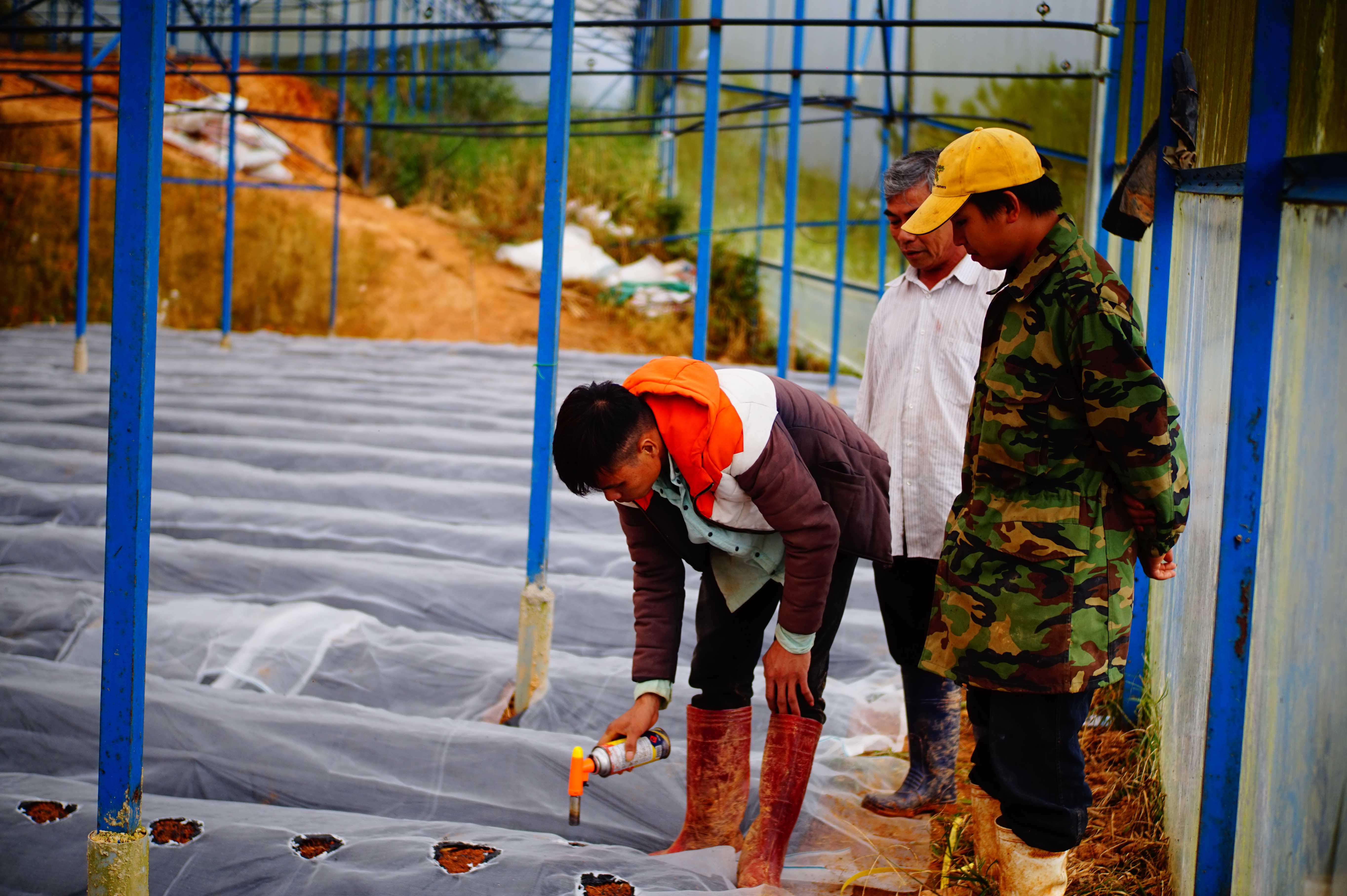 - Phủ bạt lên mặt luống và dùng đinh nhựa hoặc kẽm ghim xuống cố định bạt, có thể dùng bạt nilon đen hoặc dùng lưới lan, có thể dùng bạt chống cỏ, bạt điạ chất, có thể phủ lá thông...tùy chi phí đầu tư của nhà vườn . Mục đích là để trái dâu nằm trên đó, không tiếp xúc với mặt đất để không bị thối trái, yêu cầu bạt phủ sao cho khi tưới nước vẫn thoát và rút được nước.