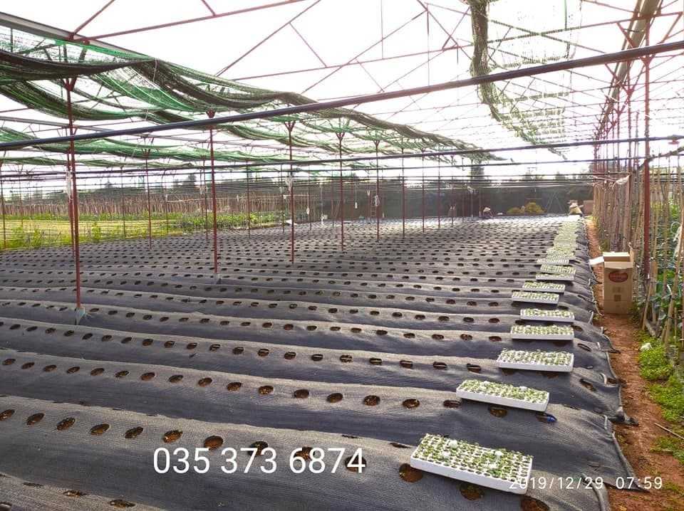 - Tiếp theo là đục lỗ trên bạt để lấy vị trí trồng dâu vào, 1 luống nên trồng hai hàng, so le nhau, hàng cách hàng khoảng 40 cm, cây cách cây 25 – 30 cm tùy giống dâu.