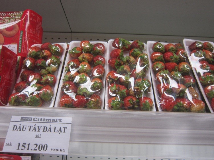Hầu hết các hệ thống siêu thị ở Sài Gòn đều cung cấp dâu tây. Tuy nhiên qua khảo sát một số điểm (siêu thị, gian hàng bán lẻ), có các thực trạng như sau: